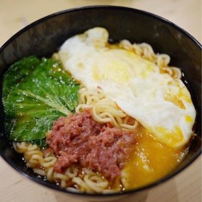 Indomie kuah dengan telur dan kornet beef. Rasa original dan cakalang.