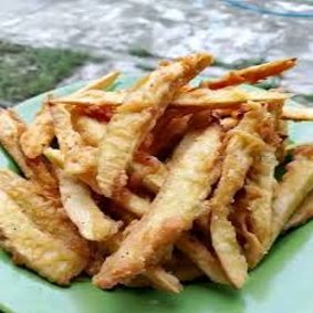 Pisang goroho digoreng krispi dengan tepung dan dabu-dabu roa.
